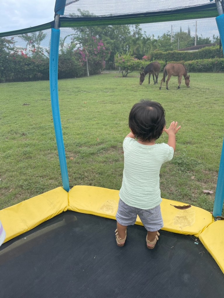 でも息子にはいい経験がいっぱいありました。初のトランポリン。まだ飛べないけど、不安定でグラグラなのを楽しんでいます。横に普通にロバがいます。